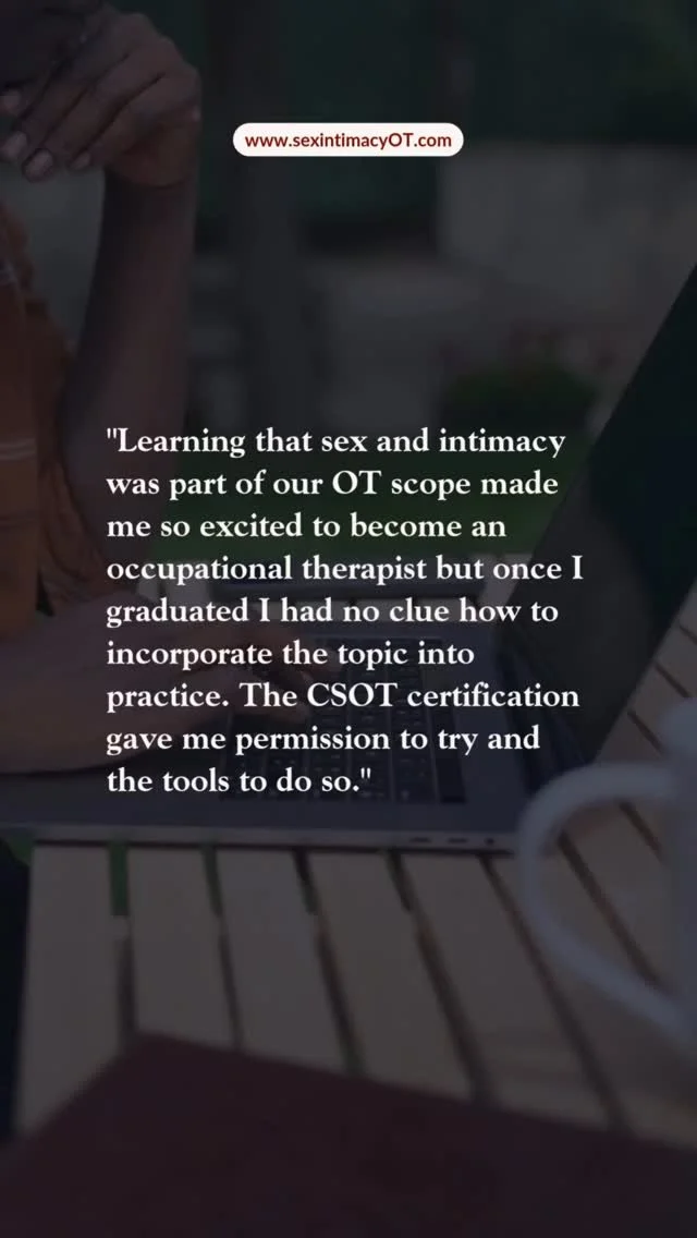 Whether you're a seasoned OT, a current student, or an OT professor, becoming a CSOT offers specialized education, enhanced patient care, and distinguishes you in the field by confidently addressing sexual health and intimacy issues.